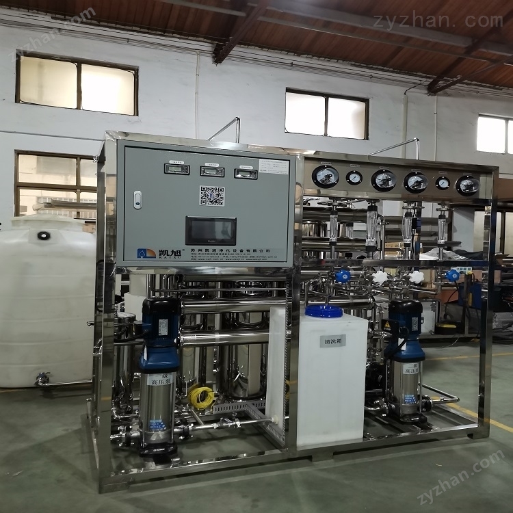 2、反滲透系統(tǒng):核心為雙級(jí)反滲透裝置(RO),通過(guò)高壓泵將水加壓,使水分子透過(guò)半透膜而截留離子、微生物等雜質(zhì),實(shí)現(xiàn)高效脫鹽。該系統(tǒng)通常包括一級(jí)和二級(jí)反滲透膜組件,確保出水電導(dǎo)率達(dá)標(biāo)。